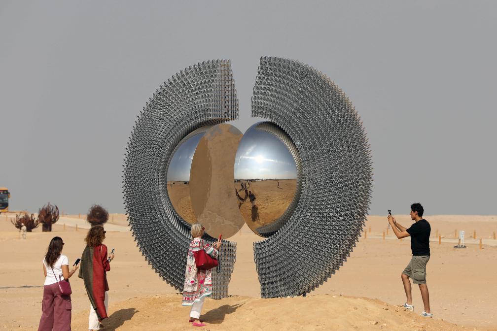 11月11日,在埃及吉萨金字塔景区,游客观看“现在即永恒”国际艺术展的一件艺术作品。