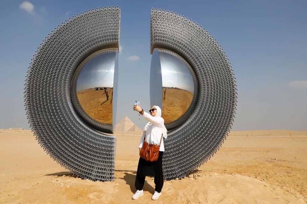 11月11日,在埃及吉萨金字塔景区,游客在“现在即永恒”国际艺术展上的一件艺术作品前自拍。