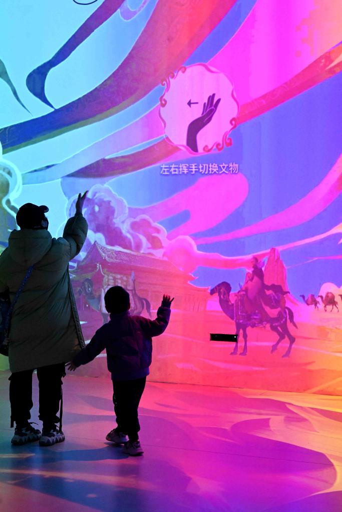 1月13日,小朋友在河北博物院数字互动体验展中体验。