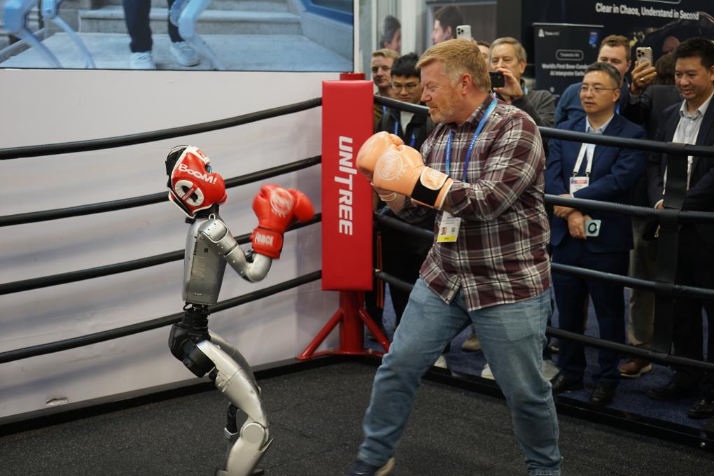 1月8日,在美国拉斯维加斯消费电子展上,参观者与宇树机器人互动。