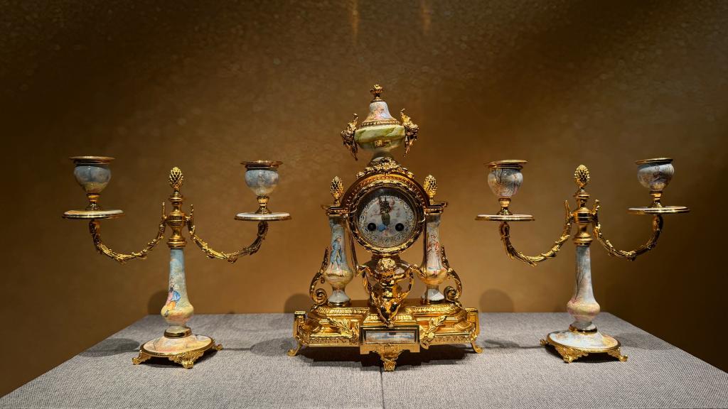 展览中,19世纪法国制造的铜镀金珐琅人物雕塑三件套壁炉钟吸引众多观众驻足。“壁炉钟是当时欧洲家庭居室中极具代表性的计时陈设,常置于客厅或卧室的壁炉架中央。”姜晔说,壁炉钟以主钟居中,两侧配有烛台或装饰瓶,构成和谐统一的三件套组合,既是实用计时器,也是室内艺术的重要组成部分。