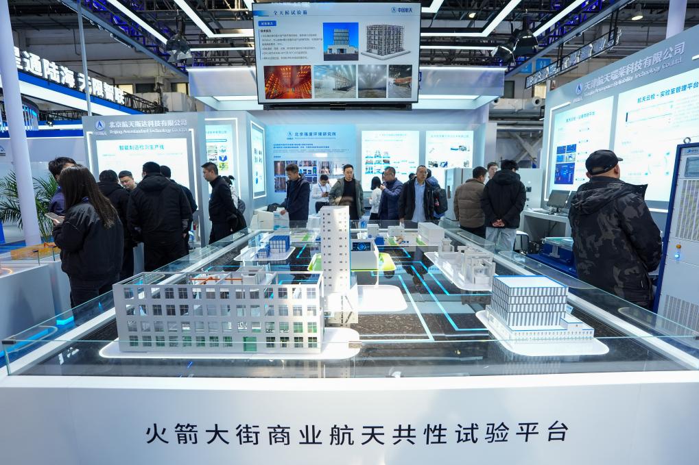 1月23日,观众在2026北京国际商业航天展的北京强度环境研究所展台参观展出的火箭大街商业航天共性试验平台模型。