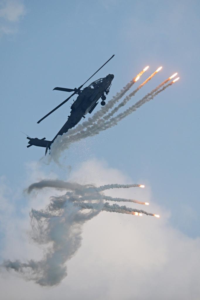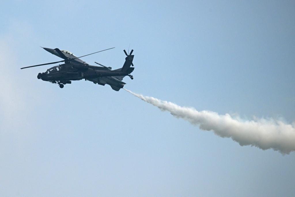 2月1日,在新加坡樟宜展览中心举行的新加坡航展媒体预演上,一架新加坡空军阿帕奇AH-64D直升机进行飞行表演。