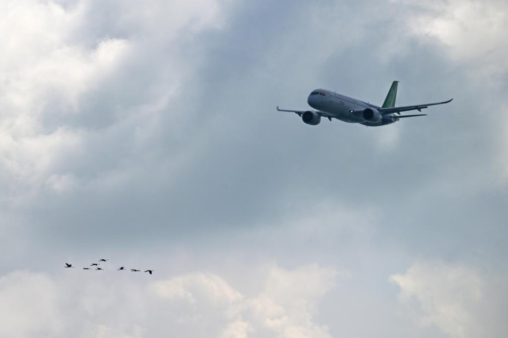 2月1日,在新加坡樟宜展览中心举行的新加坡航展媒体预演上,一架中国商飞的C919飞机进行飞行表演。